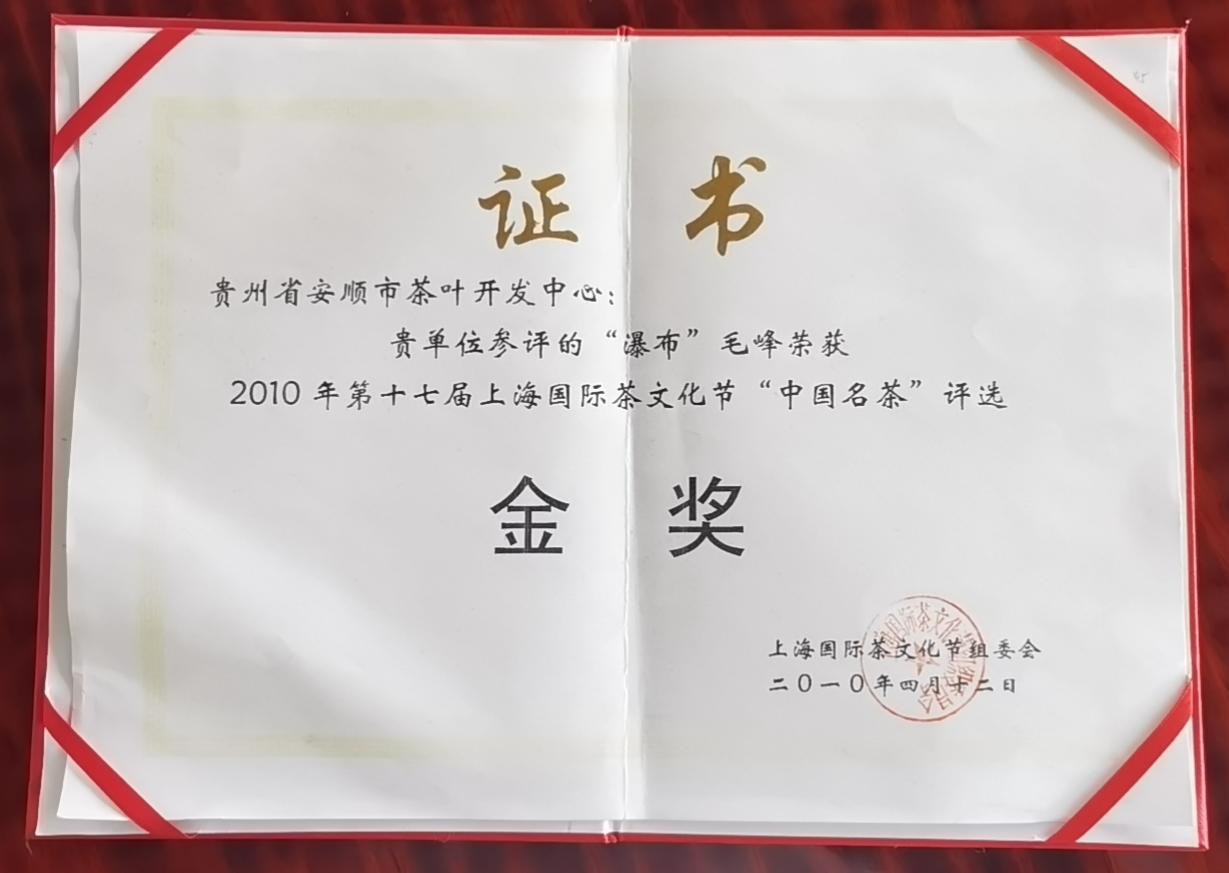 “瀑布”毛峰榮獲2010年第十七屆上海國際茶文化節“中國名茶”評選金獎