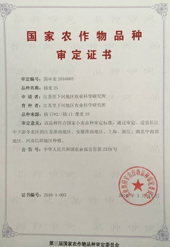 揚麥25是江蘇里下河地區農業科學研究所用揚17*2、揚11和豫麥18選育的春性小麥品種。由江蘇里下河地區農業科學研究所提出品種申請,2016年3月24日經第三屆國家農作物品種審定委員會第七次會議審定通過,審定編號為國審麥2016003。
